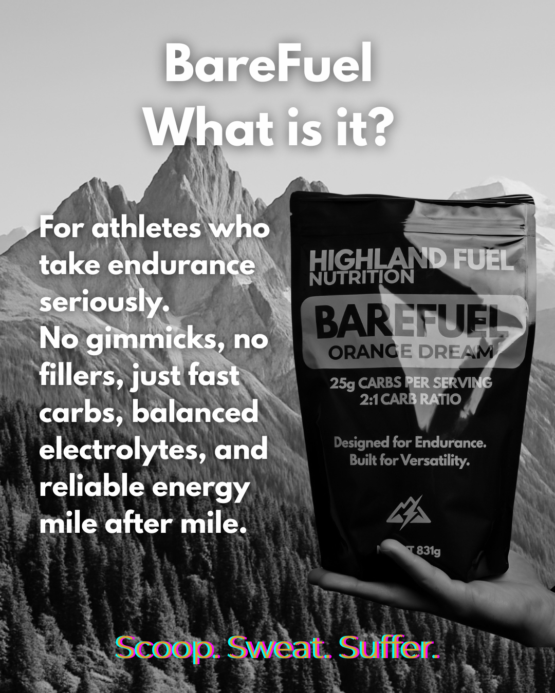 BareFuel is stripped-back endurance fuel — a dual-carb + electrolyte blend designed to power long miles, tough climbs, and hard races. Nothing unnecessary. Just what your body needs to go further.